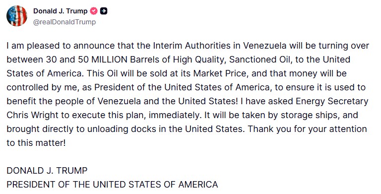 Presiden Trump mengumumkan melalui Truth Social bahwa minyak tersebut akan “dijual dengan harga pasar” dan hasilnya “dikendalikan oleh saya, sebagai Presiden Amerika Serikat.” Dengan harga sekitar $56 per barel, transaksi ini bisa bernilai hingga $2,8 miliar.