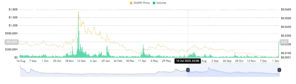 Jakarta, Pintu News – JasmyCoin baru-baru ini mencapai puncak dua bulan terakhir, dengan kenaikan yang signifikan didorong oleh permintaan tinggi di pasar Futures. Setelah mengalami penurunan selama kuartal keempat tahun 2025, koin ini menunjukkan momentum bullish yang kuat di awal tahun 2026.