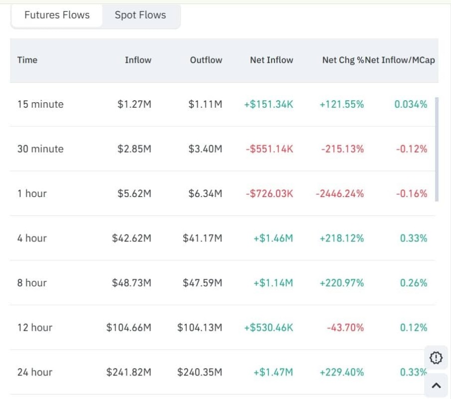 Peningkatan simultan dalam OI dan volume menandakan partisipasi yang lebih besar dalam Futures, baik untuk posisi long maupun short. Lonjakan modal yang signifikan terjadi di pasar Futures, dengan aliran masuk mencapai $247,4 juta dibandingkan dengan aliran keluar sebesar $245,4 juta. Hal ini mengindikasikan peningkatan modal yang digunakan untuk leverage, hedging, dan taruhan arah pasar oleh para trader.