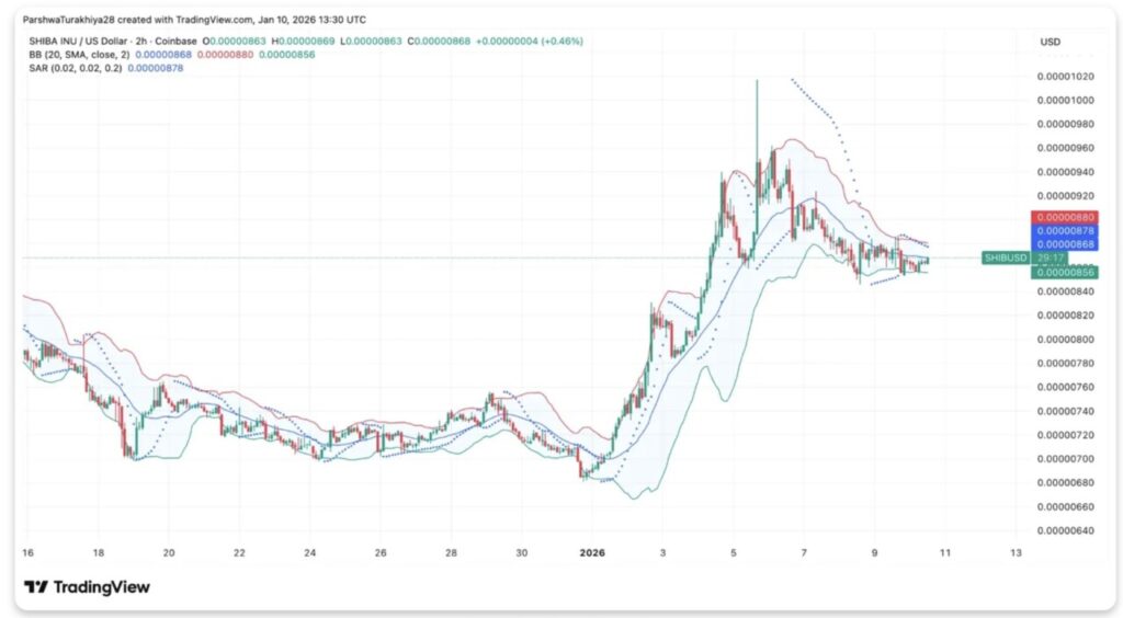 Pada timeframe 2 jam (10/1/26), SHIB terlihat sedang berkonsolidasi di dekat middle Bollinger Band di level $0.00000868, setelah reli tajam sebelumnya mencapai puncaknya di $0.00001020. Saat ini, harga sedang menguji level tersebut sebagai support, dengan lower band di $0.00000856 sebagai lantai dukungan berikutnya.