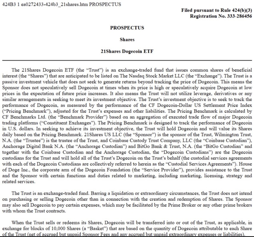 21Shares telah mengajukan prospektus final untuk meluncurkan ETF Dogecoin miliknya, menurut dokumen pengajuan 424B3 kepada Komisi Sekuritas dan Bursa AS (SEC). Hal ini membuka jalan bagi ETF Dogecoin dari 21Shares untuk diluncurkan sesuai rencana dalam minggu ini.