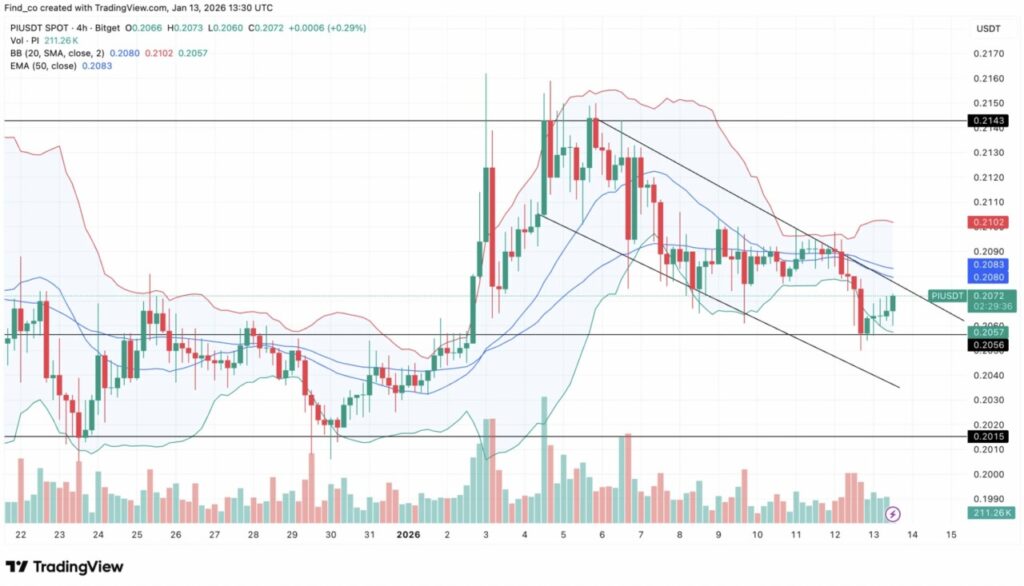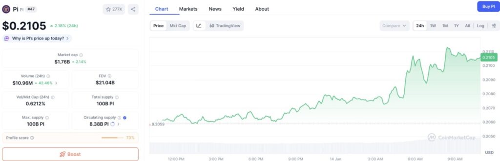 Pada tanggal 14 Januari 2026, harga Pi Network (PI) mencatat kenaikan sebesar 2,18% dalam 24 jam terakhir, diperdagangkan di level $0,2105. Dalam grafik pergerakan harian, PI menunjukkan tren kenaikan yang stabil sejak semalam, dengan beberapa lonjakan tajam menjelang pagi hari waktu global.