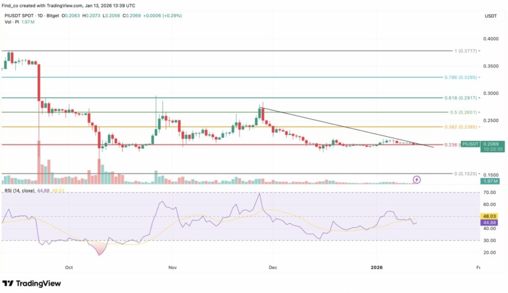 Perubahan ini menandai transisi dari struktur pasar yang bullish menjadi bearish. Sampai PI mampu merebut kembali dan bertahan di atas titik lower high utama terakhirnya, tren besar masih condong ke arah penurunan.