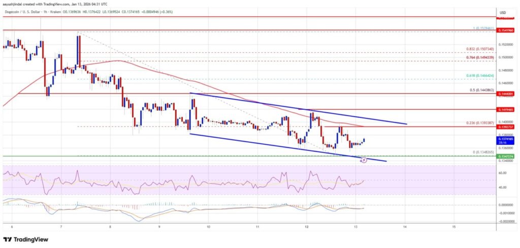 Setelah penutupan di bawah $0,1500, harga Dogecoin (DOGE) memulai penurunan baru yang mirip dengan Bitcoin dan Ethereum . DOGE turun di bawah level dukungan $0,1450 dan $0,1420. Harga bahkan sempat diperdagangkan di bawah $0,140, mencapai titik terendah di dekat $0,1348, dan saat ini menunjukkan tanda-tanda bearish. Kini, DOGE berkonsolidasi di bawah level retracement Fibonacci 23,6% dari pergerakan turun dari titik tinggi $0,1539 ke titik rendah $0,1348.
