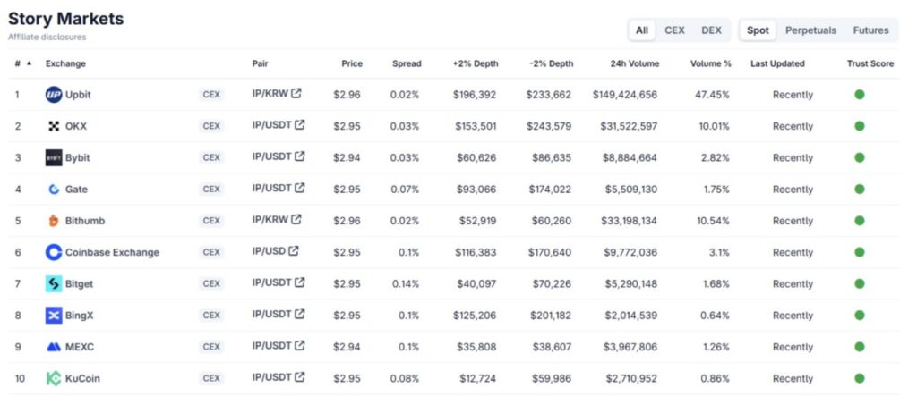 Bursa kripto Upbit menyumbang lebih dari 47% dari total volume perdagangan. Upbit sendiri merupakan salah satu platform kripto terbesar di Korea Selatan. Fakta ini menegaskan bahwa para trader Korea menjadi kekuatan utama di balik reli harga IP.