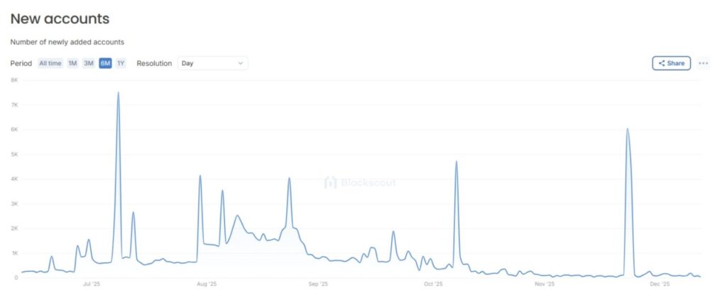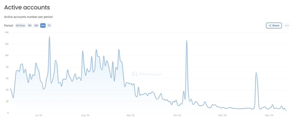 Jumlahnya bahkan turun drastis ā dari lebih dari 10.000 tahun lalu menjadi kurang dari 500 saat ini. Penurunan ini mencerminkan penyusutan sekitar 95%. Jumlah pengguna baru harian di jaringan Layer-1 ini juga nyaris tidak berubah, tetap di bawah 100 per hari. Angka ini jauh lebih rendah dibandingkan rata-rata lebih dari 2.000 per hari yang tercatat pada Agustus dan September tahun lalu.