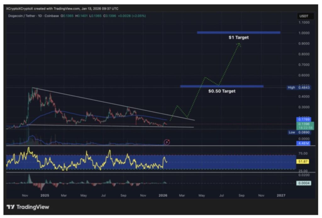 DOGE sempat diperdagangkan di kisaran $0,14 setelah mengalami pergerakan naik-turun selama beberapa bulan.
