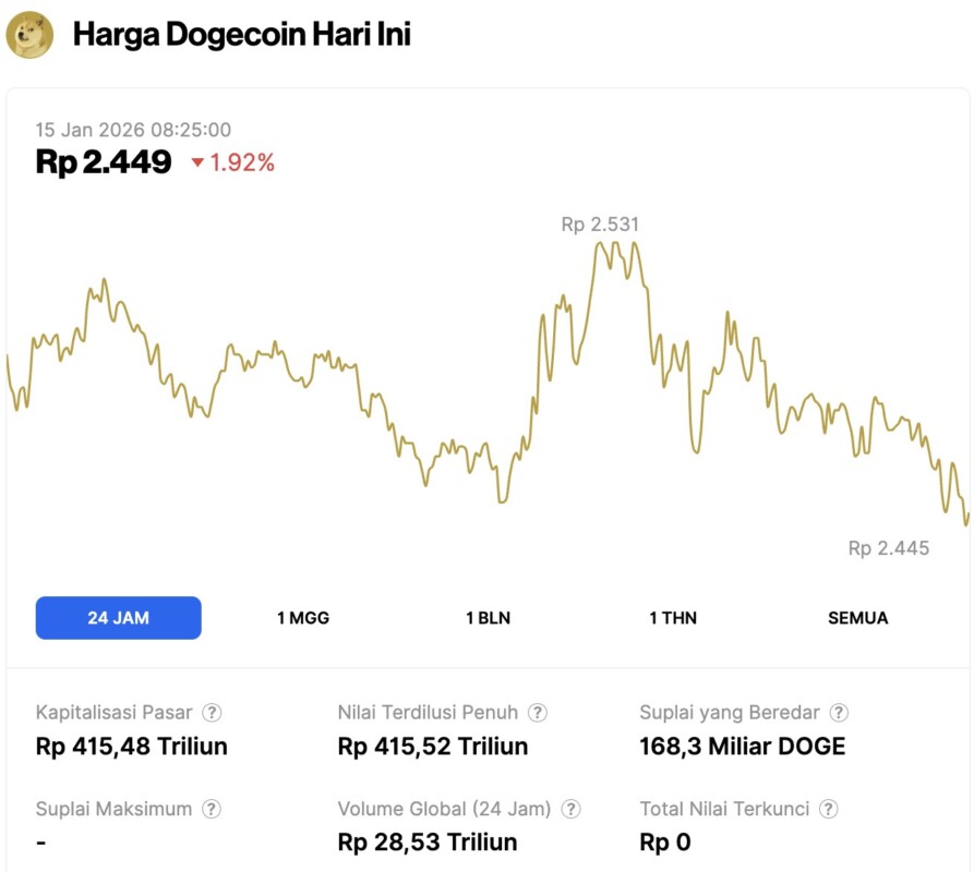 Pada 15 Januari 2026, harga Dogecoin tercatat mengalami koreksi 1,92% dalam waktu 24 jam, diperdagangkan pada harga $0.1456 atau setara dengan Rp2.449. Dalam periode 24 jam terakhir, harga DOGE bergerak dalam kisaran Rp2.531 hingga ke Rp2.445.