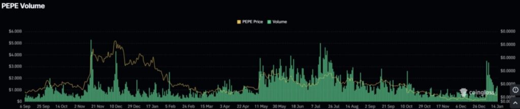 Harga Pepe Coin mengalami kenaikan yang signifikan, naik sebesar 14% pada hari Rabu (14/1), melanjutkan tren positif dari hari sebelumnya.