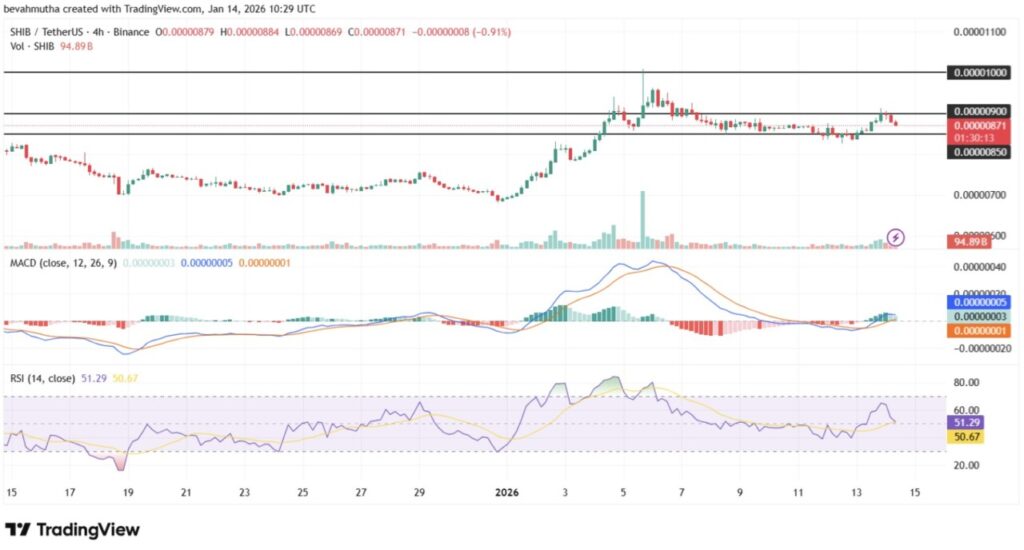 Harga Shiba Inu mengalami lonjakan sebagai bagian dari reli yang lebih luas di pasar meme coin. Pada hari Rabu (14/1), SHIB sempat diperdagangkan di harga $0.000008781 setelah mengalami rebound sebesar 7%. Namun, SHIB masih belum mampu menembus level resistensi di $0.0000092 yang telah bertahan sejak bulan November.