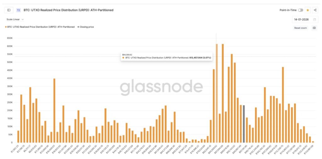 Di atas level saat ini, zona pasokan paling signifikan berada di atas $112.000. Setelah melewati area ini, pasokan yang direalisasikan berkurang drastis, sehingga jalur menuju harga tertinggi sebelumnya menjadi lebih mulus secara struktural.