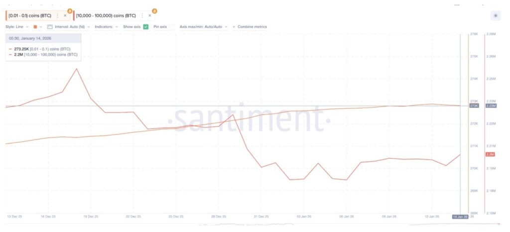 Perilaku pemegang Bitcoin saat ini masih mendukung potensi kenaikan harga. Dompet yang menyimpan antara 10.000 hingga 100.000 BTC terus menambah kepemilikannya sejak 2 Januari, naik dari sekitar 2,18 juta BTC menjadi sekitar 2,20 juta BTC. Akumulasi diam-diam ini menunjukkan keyakinan dari para pemain besar (whales).
