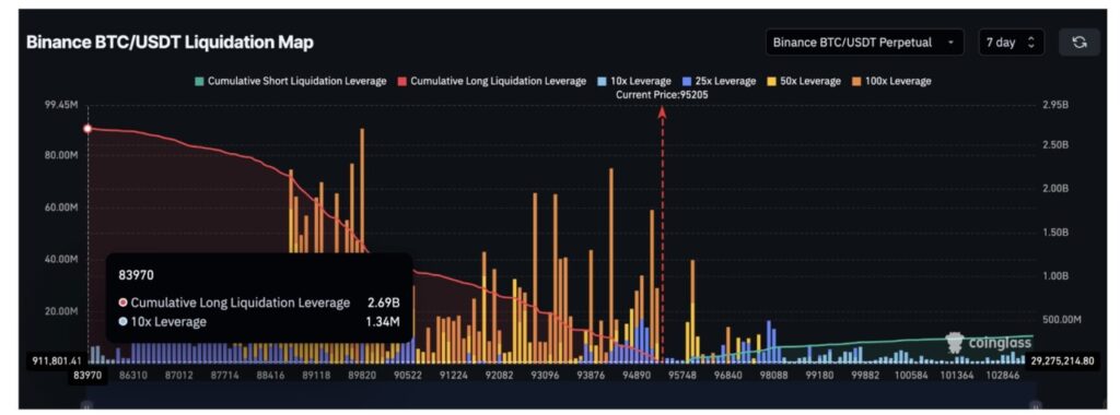 Jika BTC jatuh di bawah $94.800, bisa terjadi likuidasi posisi long, yang dapat mendorong harga turun ke kisaran rendah $90.000.