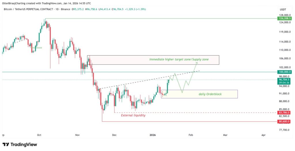 Dalam jangka pendek, semua mata tertuju pada $100.000 sebagai target berikutnya. Namun, dari sudut pandang teknis, zona pasokan utama berikutnya berada lebih tinggi, antara $103.300 dan $107.500. Dari $95.000 hingga $103.300, resistensi yang ada cukup tipis, memberikan ruang yang cukup untuk ekspansi harga jika momentum ini terus berlanjut.