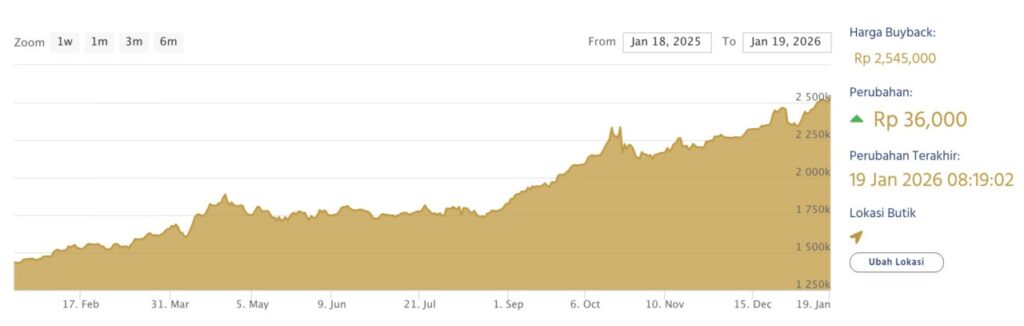 Jika melihat grafik harga setahun terakhir (18 Januari 2025 – 19 Januari 2026), harga emas menunjukkan pertumbuhan yang stabil dengan kenaikan signifikan terutama sejak September 2025. Setelah sempat mengalami konsolidasi di pertengahan tahun, tren bullish mulai terbentuk dengan peningkatan harga yang lebih tajam menjelang akhir tahun.