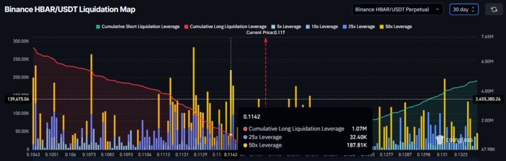 Jika dukungan ini jebol, kemungkinan akan memicu likuidasi yang diharapkan. Langkah ini bisa mendorong HBAR menuju $0,109, memperkuat struktur penurunan yang lebih luas. Namun, skenario pemulihan masih mungkin terjadi. Jika momentum bullish kembali dan tekanan jual mereda, HBAR bisa bergerak lebih tinggi.