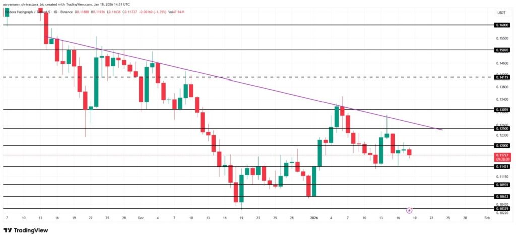 Harga Hedera (HBAR) telah berada dalam tren menurun yang jelas selama hampir dua bulan. Saat ini, token diperdagangkan di dekat $0,117, hanya sedikit di atas level dukungan $0,114 yang telah bertindak sebagai pertahanan jangka pendek terhadap kerugian yang lebih dalam. Mengingat momentum bearish yang berlaku, kemungkinan kehilangan dukungan ini tetap tinggi.