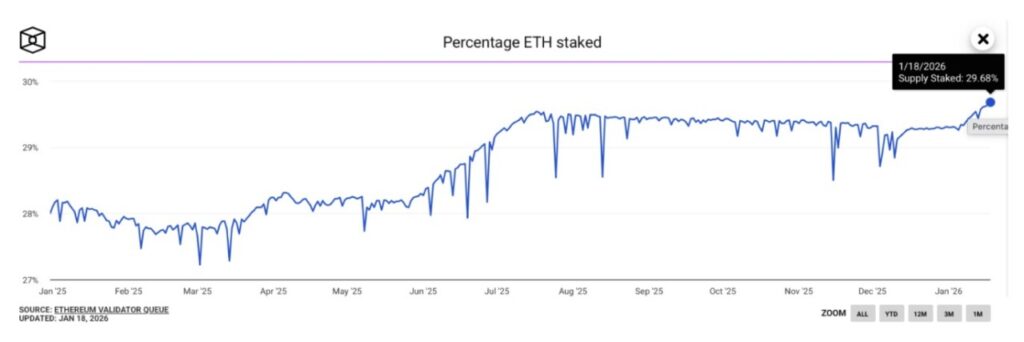 Dengan kata lain, meskipun angka staking mencapai level tertinggi sepanjang masa, kondisi ini lebih tepat digambarkan sebagai konsentrasi tinggi ETH yang dikunci dalam kontrak deposit Proof-of-Stake (PoS).