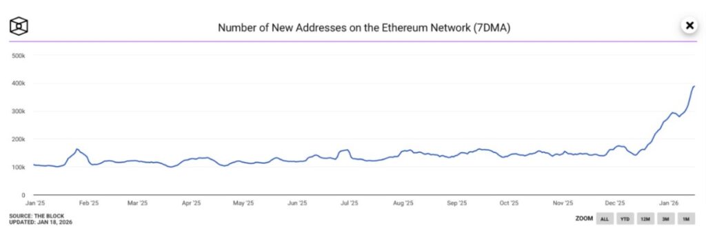 Setelah mengalami tren datar yang cukup lama, aktivitas jaringan Ethereum kini meningkat tajam. Rata-rata pergerakan 7 hari dari jumlah alamat baru Ethereum melonjak drastis memasuki Januari 2026, mencapai level tertinggi dalam grafik historisnya.