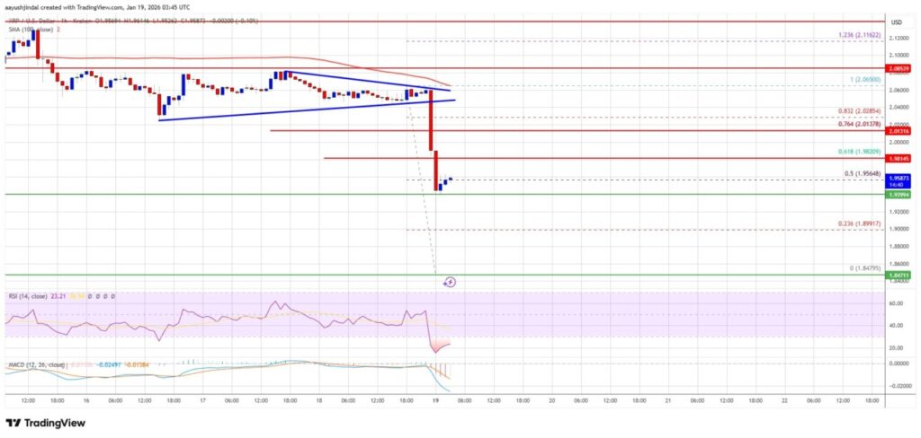 Harga XRP sempat gagal mempertahankan level di atas US$2,00, sehingga pergerakan turun berlanjut ke bawah area tersebut setelah penembusan garis support teknikal. Penurunan ini menunjukkan bahwa momentum jual sempat mendominasi pasar dalam jangka pendek. Saat ini harga berada di bawah 100-hour SMA, menunjukkan tekanan bearish tetap ada.