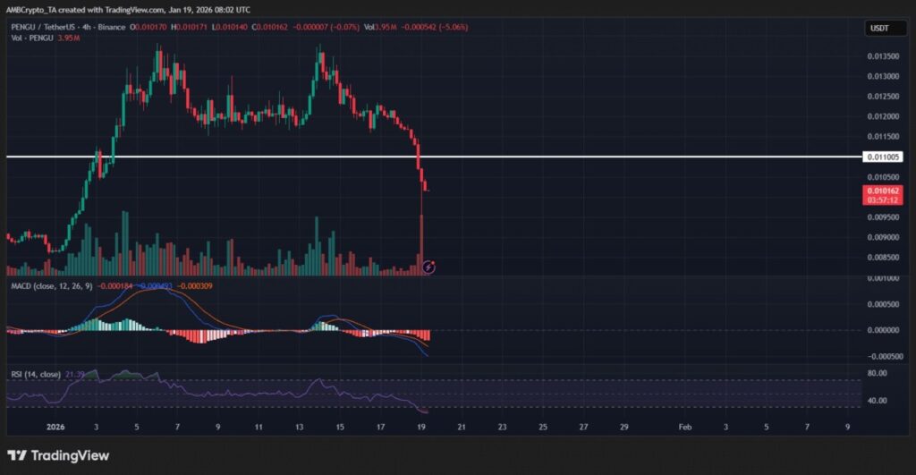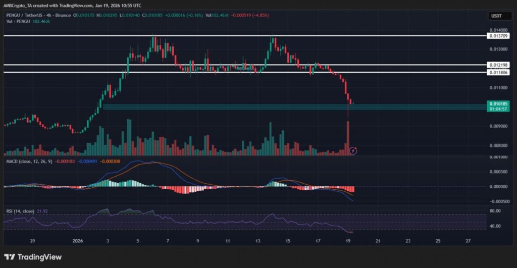 Meskipun harga turun tajam, beberapa data pasar menunjukkan PENGU sempat menemukan area support yang relatif stabil di sekitar level harga yang lebih rendah. Analisis teknikal menunjukkan bahwa harga terkadang bertahan di bawah titik psikologis tertentu sebelum mencoba konsolidasi.