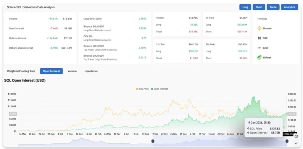 Open interest turun sebesar 7,66% menjadi $8,16 miliar, sementara volume perdagangan justru melonjak dua kali lipat menjadi $13,37 miliar. Penurunan OI yang dibarengi dengan peningkatan volume menandakan adanya penutupan posisi secara paksa, bukan aksi jual alami. Posisi long berleverage berada di sisi yang salah dari pergerakan dan terpaksa keluar dari pasar.