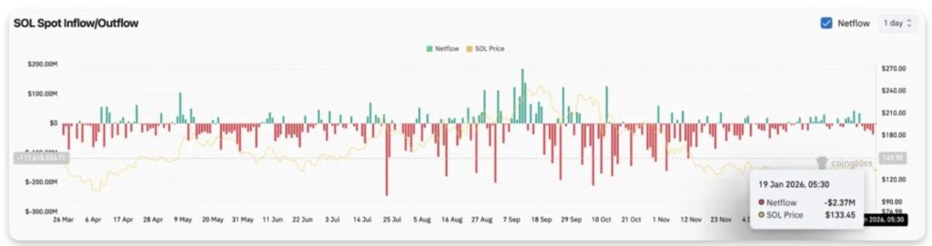 Data arus dana dari bursa menunjukkan bahwa pemegang aset spot juga mulai keluar dari pasar. Coinglass mencatat arus keluar bersih sebesar $2,37 juta pada 19 Januari, yang turut menambah tekanan jual dari likuidasi di pasar derivatif.