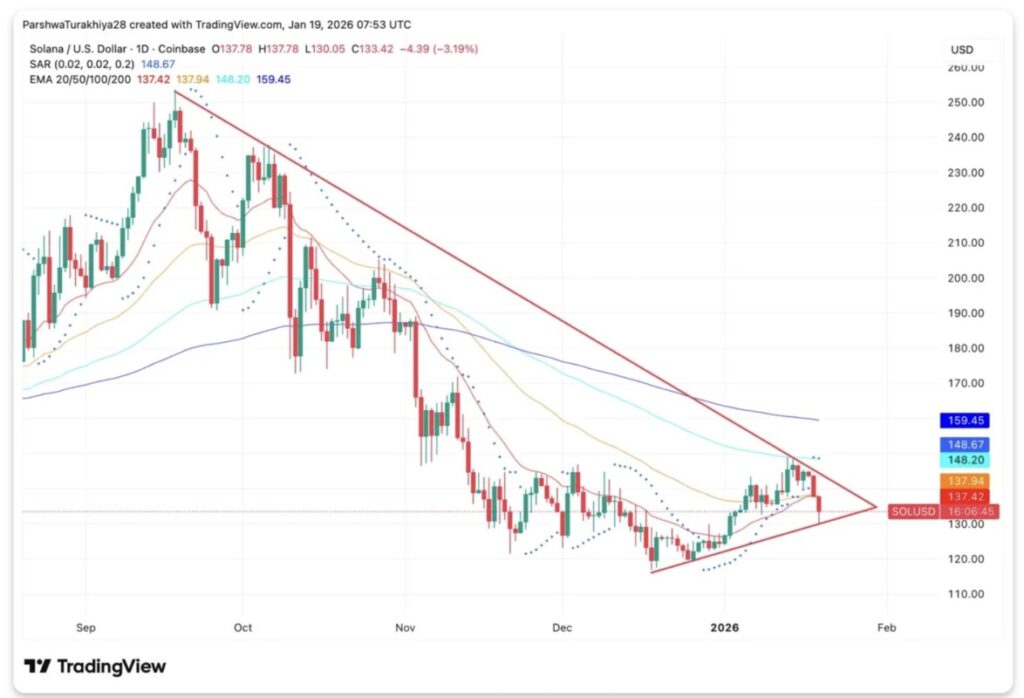Pada grafik harian (19/1), Solana telah bergerak dalam pola falling wedge sejak puncak harga di bulan September di sekitar $250. Struktur ini sebenarnya menunjukkan potensi pergerakan bullish, namun hal itu hanya valid jika harga mampu bertahan di atas area EMA.