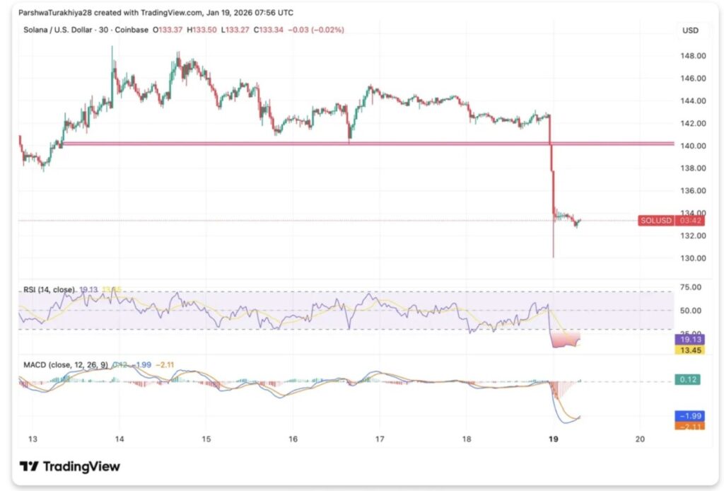 Sementara itu, indikator MACD masih menunjukkan sinyal bearish, dengan histogram yang terus melebar ke bawah. Penurunan tajam dari $144 ke $130 berhasil menembus support horizontal secara bersih, menciptakan zona resistensi baru yang harus direbut kembali oleh pihak bull.