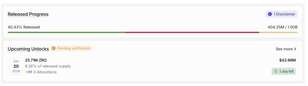 Pada 20 Januari, tim akan membuka 25,71 juta ZRO, yang setara dengan 6,36% dari pasokan yang telah beredar. Nilai total token tersebut diperkirakan mencapai $43,96 juta.