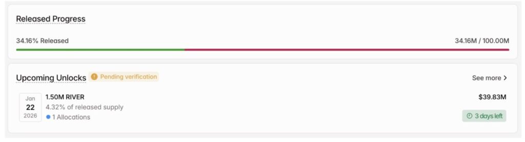 Pada tanggal 22 Januari, tim akan membuka 1,5 juta token RIVER yang bernilai sekitar $39,83 juta. Jumlah tersebut mencakup 4,32% dari pasokan yang telah beredar. Seluruh token yang dilepas akan dialokasikan untuk investor.
