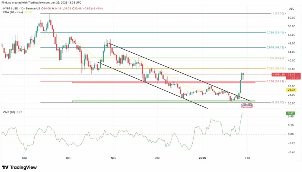 Dari grafik harian (29/1), HYPE mulai menunjukkan tanda-tanda awal pembalikan tren setelah mengalami tekanan turun selama beberapa bulan. Saat itu, harga diperdagangkan di sekitar $33,5 setelah memantul dari zona permintaan $20.