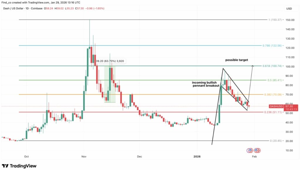 Yang krusial, harga DASH tetap berada di atas level Fibonacci 0,236 di $51,11, yang telah menjadi area support yang andal. Selama DASH bertahan di atas zona ini, struktur bullish tetap utuh. Jika terjadi breakout ke atas, target kenaikan bisa segera tercapai.