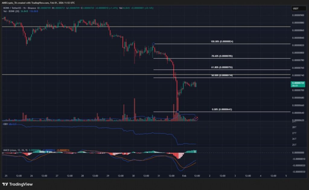 Penurunan BONK terjadi seiring melemahnya sentimen pasar crypto secara umum. Dalam beberapa hari terakhir, tekanan jual terlihat lebih dominan dibandingkan upaya pemulihan harga. Akibatnya, beberapa level support yang sebelumnya bertahan mulai ditembus dengan relatif mudah.