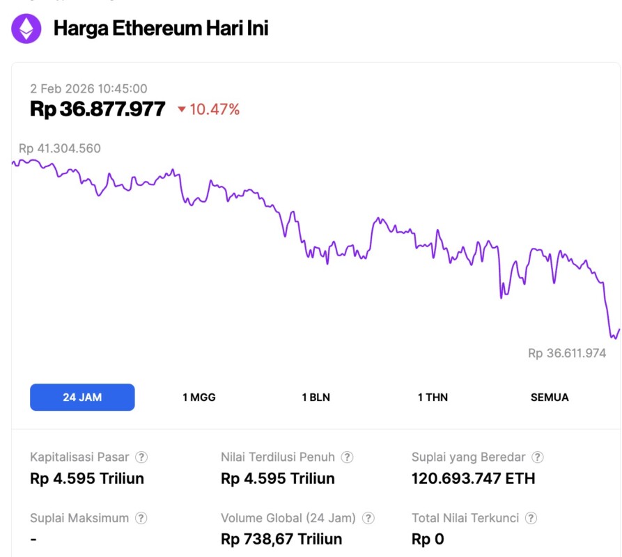 Pada 2 Februari 2026, harga Ethereum tercatat berada di sekitar $2,179 atau setara dengan Rp36.877.977, mengalami penurunan 10,47% dalam 24 jam terakhir. Sepanjang periode ini, ETH sempat menyentuh level terendahnya di Rp36.611.974 dan level tertingginya di Rp41.304.560.