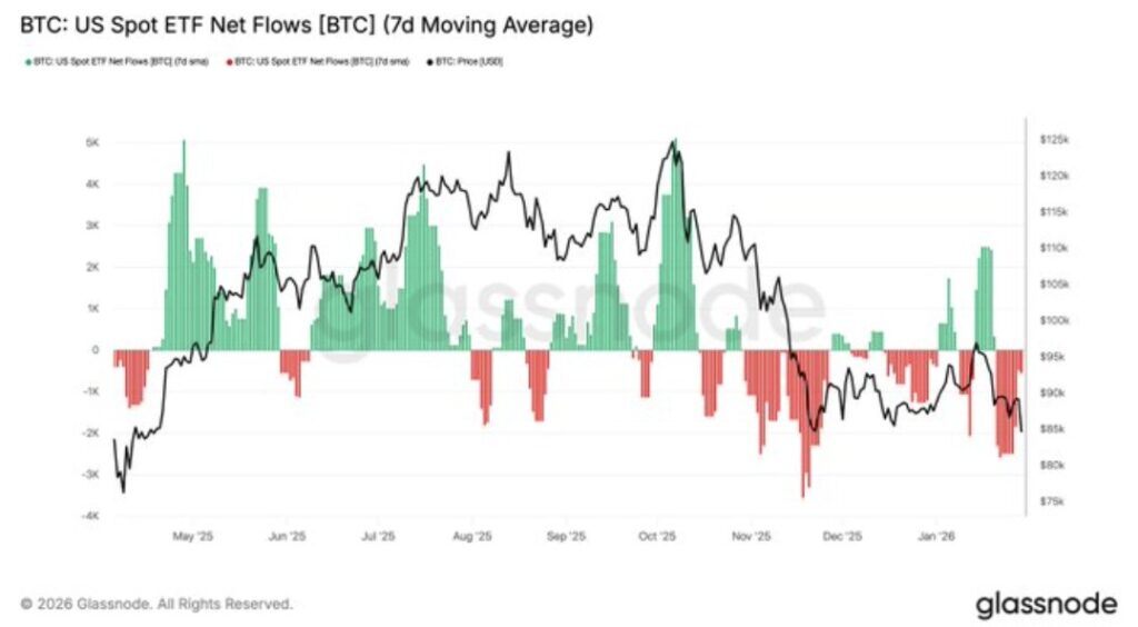 Selain itu, ETF Bitcoin spot di AS juga menunjukkan arus keluar (net outflow) baru-baru ini, yang menurut Glassnode mengurangi salah satu sumber utama permintaan spot. Tanpa arus masuk dari ETF yang bisa menyerap pasokan, tekanan turun pada harga Bitcoin menjadi lebih kuat.