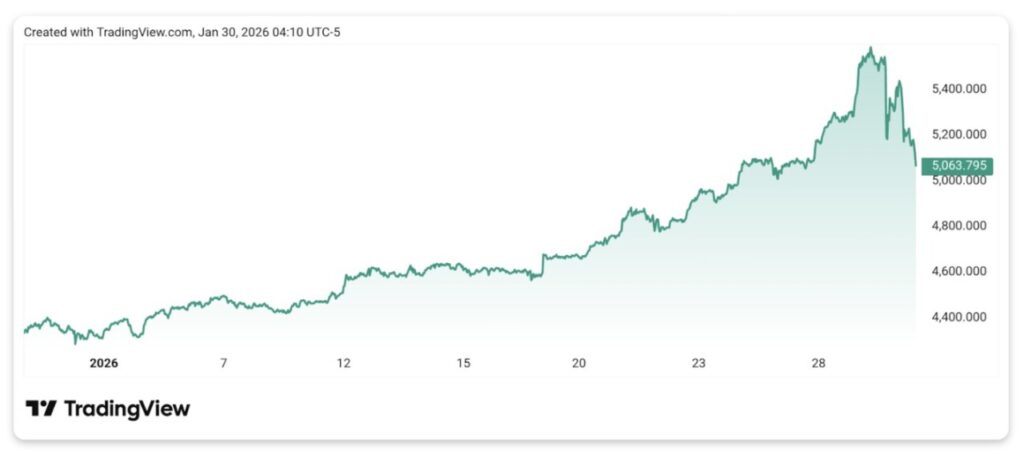 Meski mengalami penurunan harian, emas tetap mencatat kenaikan sebesar 24,68% sepanjang bulan Januariānaik $1.065,07 sejak awal bulan. Pembelian oleh bank sentral dan permintaan aset aman (safe haven) menopang harga emas selama bulan ini, terutama di tengah risiko geopolitik yang terus berlangsung dan kekhawatiran inflasi.