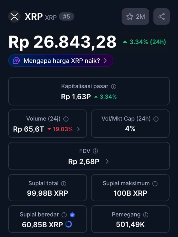 Volume perdagangan XRP dalam 24 jam terakhir mencapai miliaran Rupiah, menunjukkan bahwa token ini tetap memiliki likuiditas tinggi di pasar crypto. Volume perdagangan tinggi umumnya menunjukkan banyaknya transaksi jual-beli yang berlangsung dalam periode tersebut.
