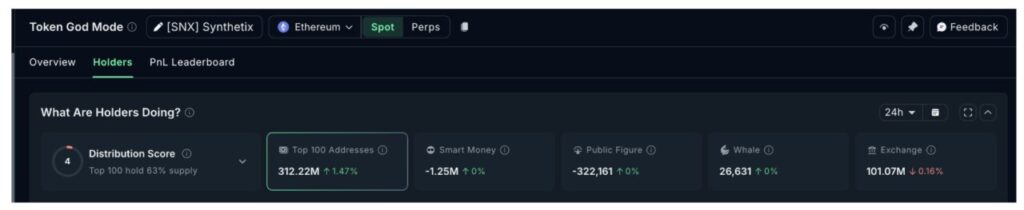 Data mengonfirmasi adanya akumulasi selektif ini. 100 alamat teratas meningkatkan kepemilikan mereka sebesar 1,47%, sehingga total simpanan mereka mencapai 312,22 juta SNX. Ini berarti mereka telah menambah sekitar 4,52 juta token SNX (21/2). Pada harga saat ini, jumlah tersebut setara dengan akumulasi senilai sekitar $1,83 juta.
