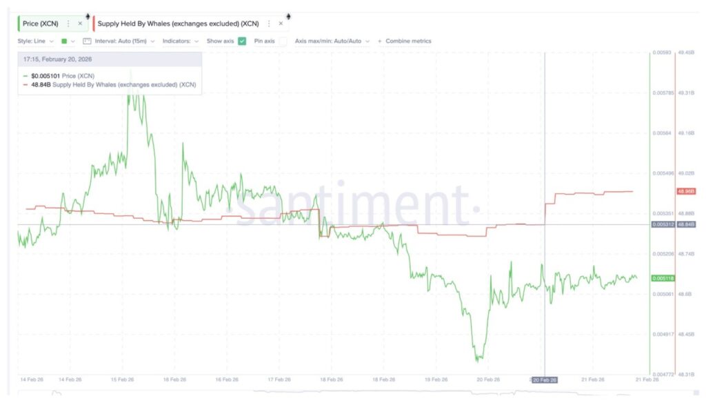 Onyxcoin (XCN) menjadi token ketiga di mana para whale crypto secara diam-diam meningkatkan eksposur mereka setelah keputusan Mahkamah Agung terkait larangan tarif Trump. Kepemilikan para whale naik dari 48,84 miliar menjadi 48,96 miliar XCN, dengan penambahan 120 juta token dalam satu hari. Pada harga saat ini (21/2), jumlah tersebut setara dengan akumulasi senilai sekitar $612.000 dalam bentuk XCN.