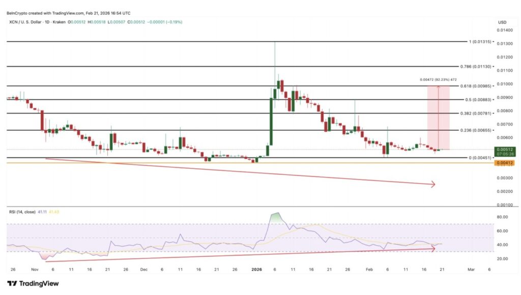 Grafik harga XCN juga mendukung strategi penempatan posisi dini ini. Antara 4 November hingga 19 Februari, XCN membentuk titik terendah yang lebih rendah (lower low) pada harga, sementara indikator Relative Strength Index (RSI) justru membentuk titik terendah yang lebih tinggi (higher low).