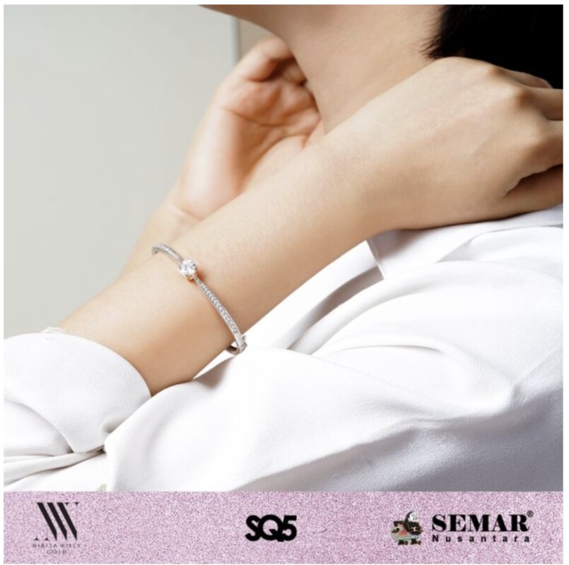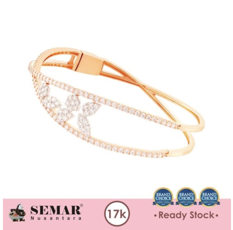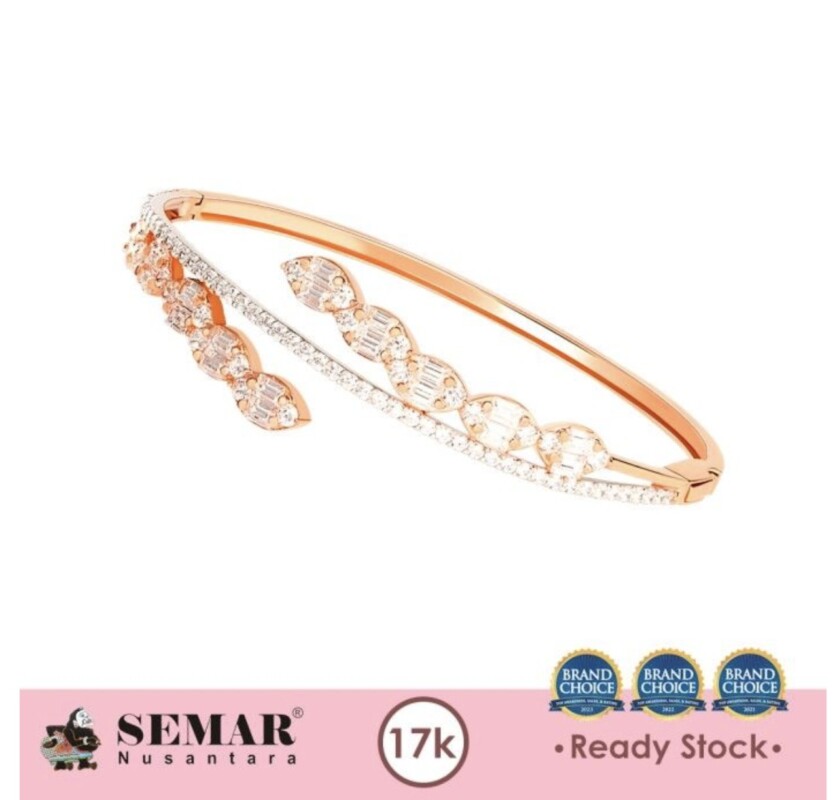 Gelang ini mengusung perpaduan warna rose gold dan white gold yang memberikan kesan modern namun tetap klasik. Desainnya yang simpel dan elegan sangat cocok dipadukan dengan kaftan berbahan satin untuk acara silaturahmi formal. Dengan berat estimasi antara 14,6 hingga 15,3 gram, gelang ini memberikan bobot kemewahan yang terasa nyata di pergelangan tangan.