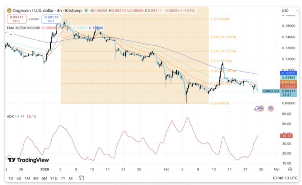 Level-level kunci tetap terdefinisi dengan jelas bagi Dogecoin seiring harga yang diperdagangkan di kisaran $0,091 pada grafik 4 jam (24/2). Struktur pasar yang lebih luas masih cenderung bearish, dengan DOGE tertahan di bawah EMA 20, 50, 100, dan 200. Namun, adanya kompresi di dekat dukungan (support) lokal menunjukkan bahwa pergerakan yang menentukan mungkin akan segera terjadi.