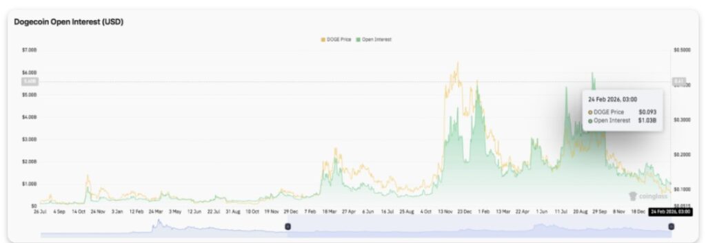 Per 24 Februari 2026, open interest berada di kisaran $1,03 miliar. Level ini menunjukkan partisipasi pasar yang moderat, alih-alih spekulasi yang euforik. Selain itu, profil leverage yang tertahan menandakan bahwa para trader mendekati level harga saat ini dengan sikap hati-hati.