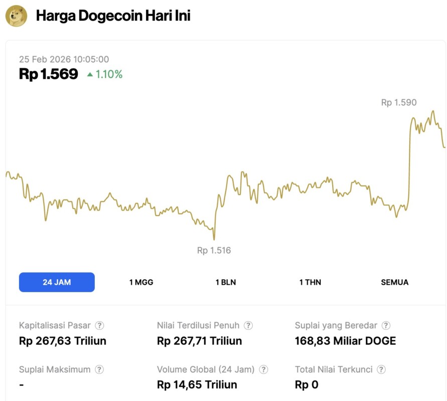 Pada 25 Februari 2026, harga Dogecoin tercatat mengalami kenaikan 1,10% dalam waktu 24 jam, diperdagangkan pada harga $0.09345 atau setara dengan Rp1.569. Dalam periode 24 jam terakhir, harga DOGE bergerak dalam kisaran Rp1.516 hingga ke Rp1.590.