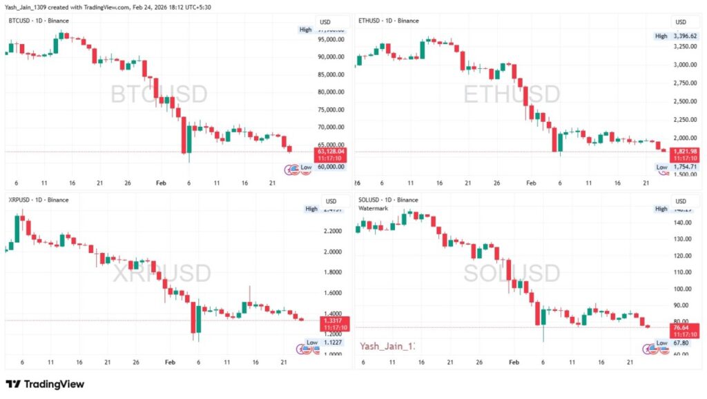 Di saat yang sama, kebijakan tarif global 15% yang diberlakukan melalui Trade Act Section 122 menambah tekanan makroekonomi. Kombinasi dua faktor ini membuat indeks Fear & Greed kripto terperosok ke zona Extreme Fear, memperkuat sentimen negatif di seluruh pasar aset digital.