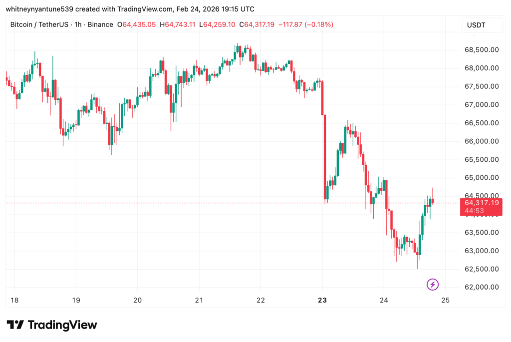 Saat ini, harga Bitcoin (BTC) masih berada di kisaran $64.438, turun 0,30% dalam 24 jam terakhir dan melemah 5,33% secara mingguan. Struktur harga jangka pendek menunjukkan tren penurunan yang jelas, dengan resistance terdekat di $65.000 dan support utama di $62.500.