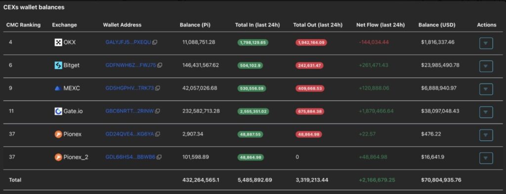 Tekanan pasokan masih membebani pergerakan Pi Network. Berdasarkan data PiScan, sekitar 2,16 juta token PI masuk ke Centralized Exchanges (CEX) dalam 24 jam terakhir. Alhasil, total kepemilikan PI di bursa terpusat kini melampaui 432 juta token PI, dengan nilai sekitar $70,80 juta.