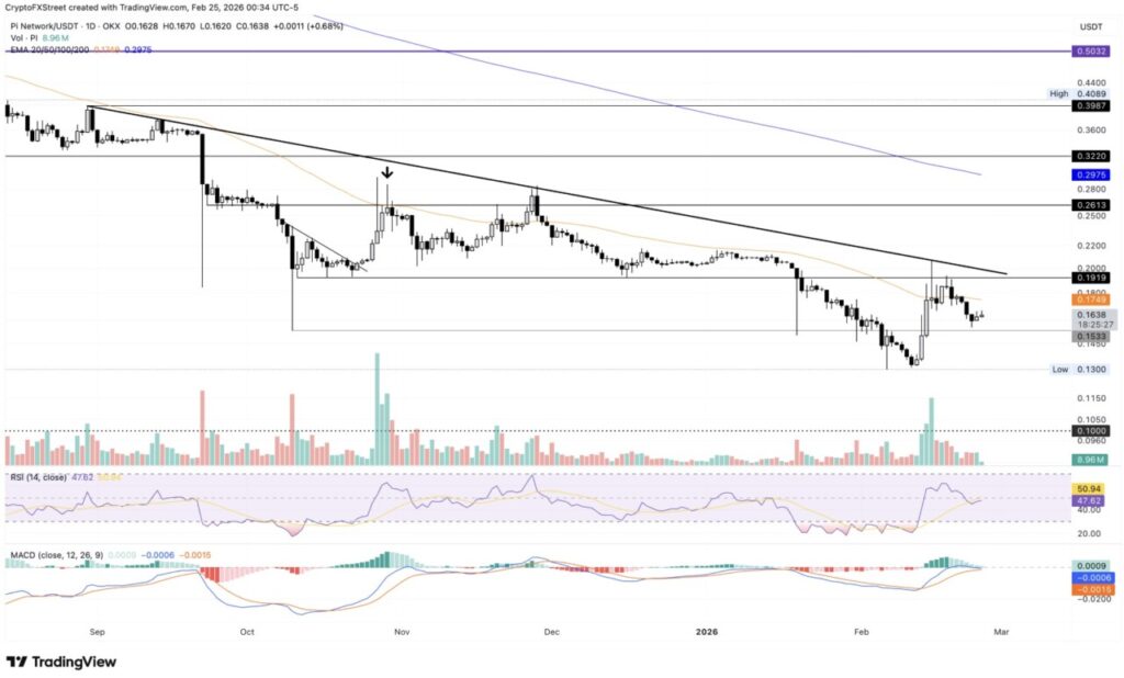 Apabila Pi Network turun dan menembus support di sekitar $0,1538, tekanan penurunan berpotensi mengarah ke level terendah sepanjang masa di $0,1300 yang tercatat pada 6 Februari. Indikator teknikal pada grafik harian juga masih condong ke arah bearish.