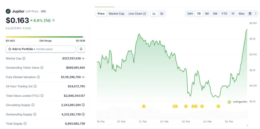Kesepakatan ini menjadi investasi institusional pertama bagi Jupiter dan menyelaraskan kepentingan ParaFi dengan agenda ekspansi platform ke sektor lending, stablecoin, serta infrastruktur perdagangan institusional. Sepanjang pekan, JUP naik dari sekitar $0,144 menjadi $0,163.
